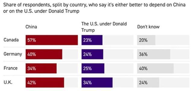 恰好就在15日,美国“政治新闻网”与英国民调机构Public First发布了一份引发热议的民调报告,在对加拿大、德国、法国和英国4国民众的调查显示,这些国家的民众都认为中国是比美国更值得信赖的国家。