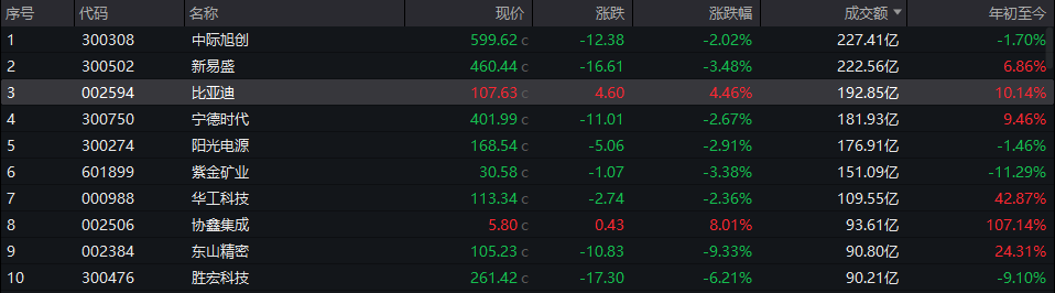 个股方面,中际旭创以全天超227亿元的成交额位居沪深两市第一,新易盛、比亚迪、宁德时代等个股成交额位居前列。
